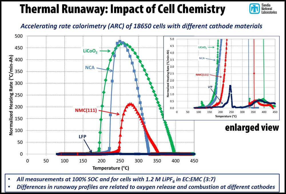 However, it is much more difficult to get LFP cells to catch fire, even if you are trying! Note that the relative heating from LFP is small enough that it does not register on the main graph above, and you have to zoom in by the factor of 100, as displayed in the inset, to see it.