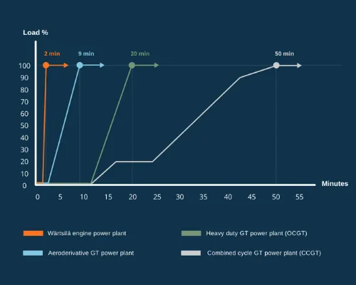 The following chart is from an article by Wärtsilä on the start up times for different types of gas generation.
